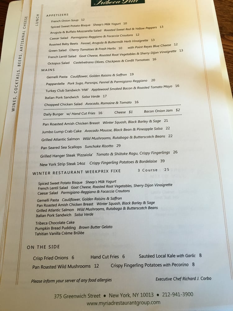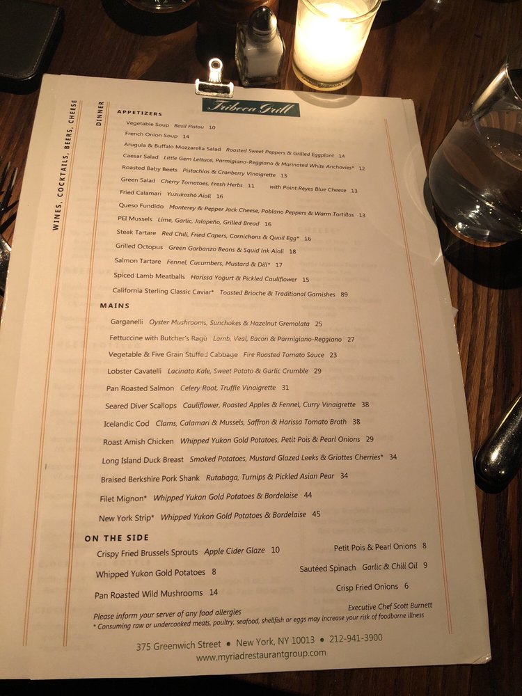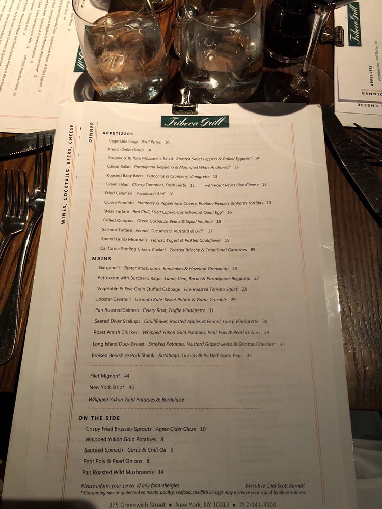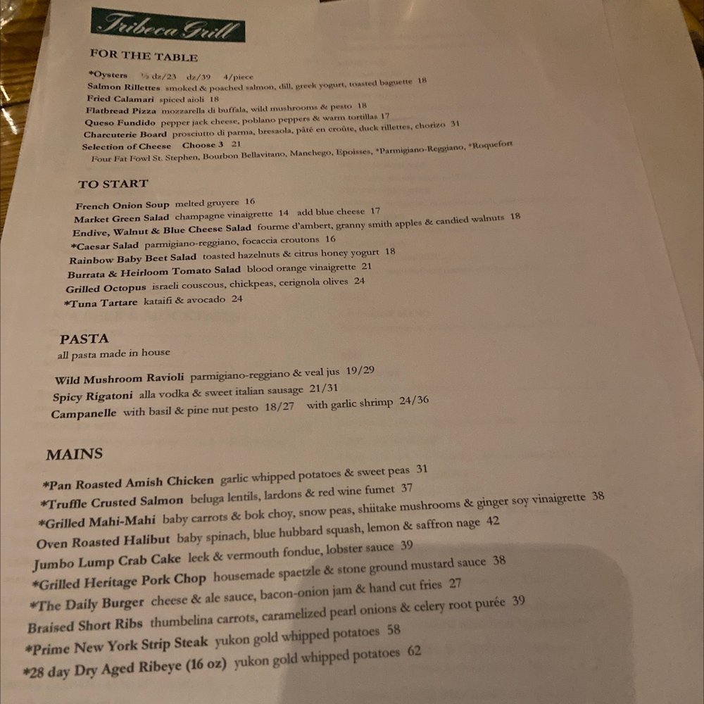 Introducing the menu at Tribeca Grill, a classy and upscale restaurant in New York offering a wide range of options for all dietary preferences. From Pescatarian and Vegan choices to many Vegetarian options, Tribeca Grill caters to everyone. The menu features a variety of dishes, from smoky burrata with heirloom tomatoes to mushroom ravioli and pork chop. Customers rave about the stellar service, delicious food, and inviting ambiance. Whether you're looking for a romantic dinner spot or a place to gather with a large group, Tribeca Grill is the perfect choice. Don't miss out on the full bar, outdoor seating, and private dining options for special occasions. Experience the best nights on Thursday, Friday, and Saturday at Tribeca Grill.